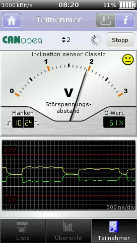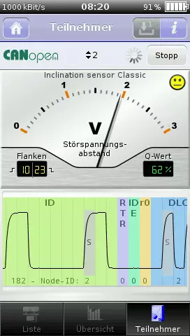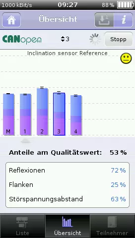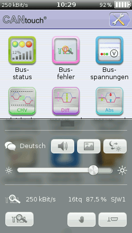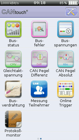 Diese Funktion dient dem sofortigen Überblick über den Zustand aller Messwerte, die das CANtouch am CAN-Bus ermitteln kann. Dazu wird automatisch die verwendete Baudrate detektiert und eine kontinuierliche Messung beginnt. Die Bewertung aller Messergebnisse der sechs freien Apps erfolgt per Smiley. Selbst eine Bewertung der Qualitätswerte aller Busteilnehmer erfolgt fortlaufend, auch wenn keine Lizenz für die Messung Teilnehmer erworben wurde. Das Smiley repräsentiert jeweils das schlechteste Messergebnis des letzten Messzyklus. Mit einem Klick kommt man in die entsprechende Messung, um eine Fehlersuche zu beginnen.