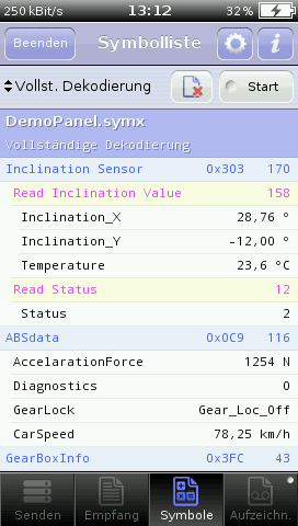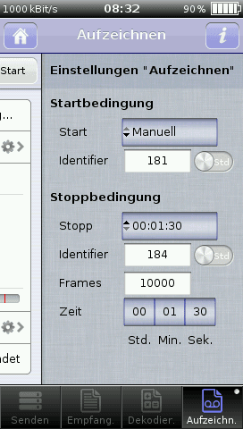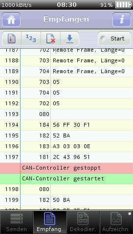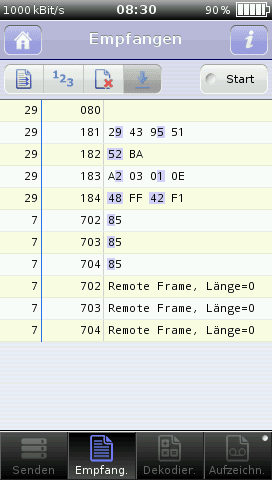 Beim Empfang erfolgt die Anzeige in Listenform oder überschreibend, der Dateninhalt wird original oder entschlüsselt dargestellt und kann für spätere Auswertung aufgezeichnet werden. Die Langzeitaufzeichnung (Trace) lässt sich durch Start- und Stop-Bedingungen beeinflussen.