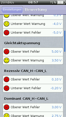 Für die physikalischen Messwerte legen Sie Grenzwerte fest, ab wann ein Fehler angezeigt werden soll. Die aktuellen Messwerte sowie die jeweiligen Minimal- und Maximalwerte können angezeigt werden. Die Überwachung einzelner Fehler lässt sich auch abschalten. Das ist zum Beispiel dann sinnvoll wenn Sie auf der Suche nach einem physikalischen Problem sind aber nicht auch bei jedem Errorframe anhalten oder akustisch signalisieren wollen.