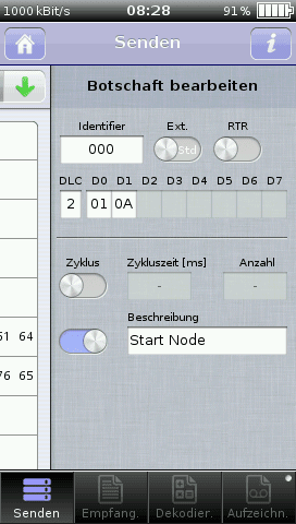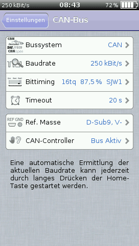 Es stehen Ihnen die notwendigen Einstellmöglichkeiten zur Verfügung um das Messgerät an Ihren Bus anzupassen. Das Gerät sucht zwar auch automatisch nach der passenden Baudrate, Sie können diese aber auch von Hand einstellen. Darüber hinaus sind Veränderungen des Bittimings möglich, was für Anlagen wichtig ist, die nicht nach CiA-Empfehlungen eingestellt sind.