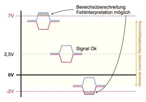 Auch wenn neuere Schaltkreise einen größeren Bereich von -7…+12 V tolerieren, kann eine Überschreitung zu Kommunikationsfehlern und im Extremfall