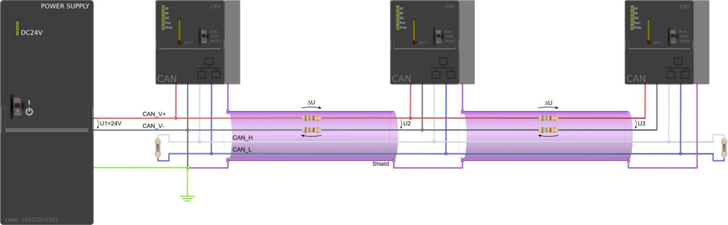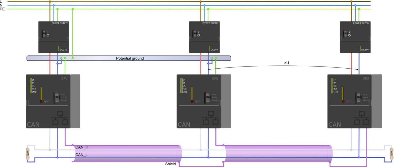 (2,5 V – 4,5 V = -2 V und 2,5 V + 4,5 V = +7 V) zulässig. Bei einem typischen CAN-Kabel mit einem Querschnitt von 0,22 mm2, einem Leitungswiderstand von 186 Ω/km und einer angenommenen Gesamtstromaufnahme von 100 mA für alle Baugruppen wird der zulässige Potentialunterschied schon nach ca. 240 m Leitungslänge erreicht, bei 1 A Stromaufnahme schon nach 24 m. Eine Verbesserung kann hier durch CAN-Kabel mit größerem Querschnitt erreicht werden.