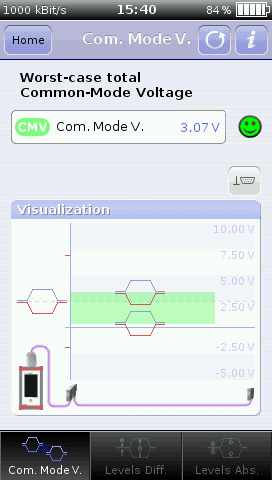 und warnt bei Überschreitung der Grenzwerte (Abb. 4: Messung der „Absoluten maximalen Gleichtaktspannung“ im CANtouch mit Smileys als Bewertungshilfe). Zusätzlich erfolgt eine graphische Visualisierung, ob sich der Spannungsversatz oberhalb oder unterhalb der eigenen Aufsteckposition befindet.